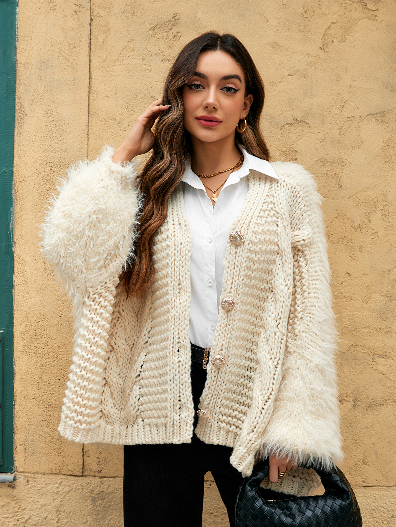 Этот мягкий и удобный кардиган отличается стильными пуговицами и изготовлен из высококачественной вязаной ткани с деликатной текстурой. Он прекрасно подходит для различных случаев, включая повседневные выезды, офисную одежду и встречи. Этот кардиган сочетает в себе элегантность и комфорт, что делает его идеальным слоем для осени и зимы.