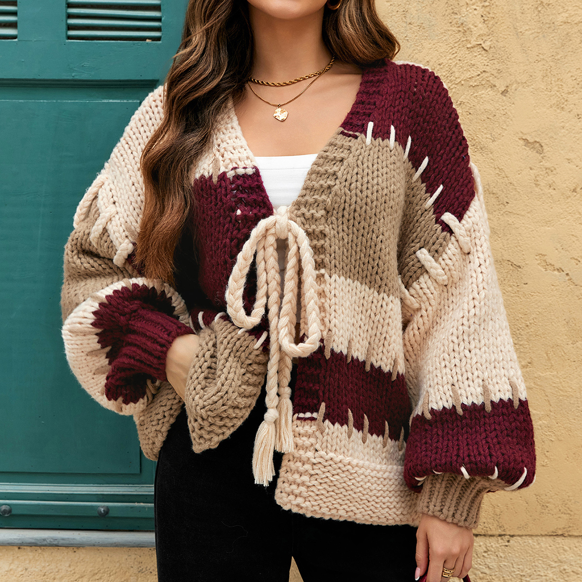 Представляем наш женский кардиган с цветным блоком! Этот стильный дизайн с открытым фронтом оснащён элегантным узлом, идеально подходящим для непринужденного выхода, офисной одежды или встреч. Изготовлен из высококачественной вязаной ткани, он предлагает мягкую, деликатную текстуру, которая прекрасно ощущается на коже.